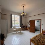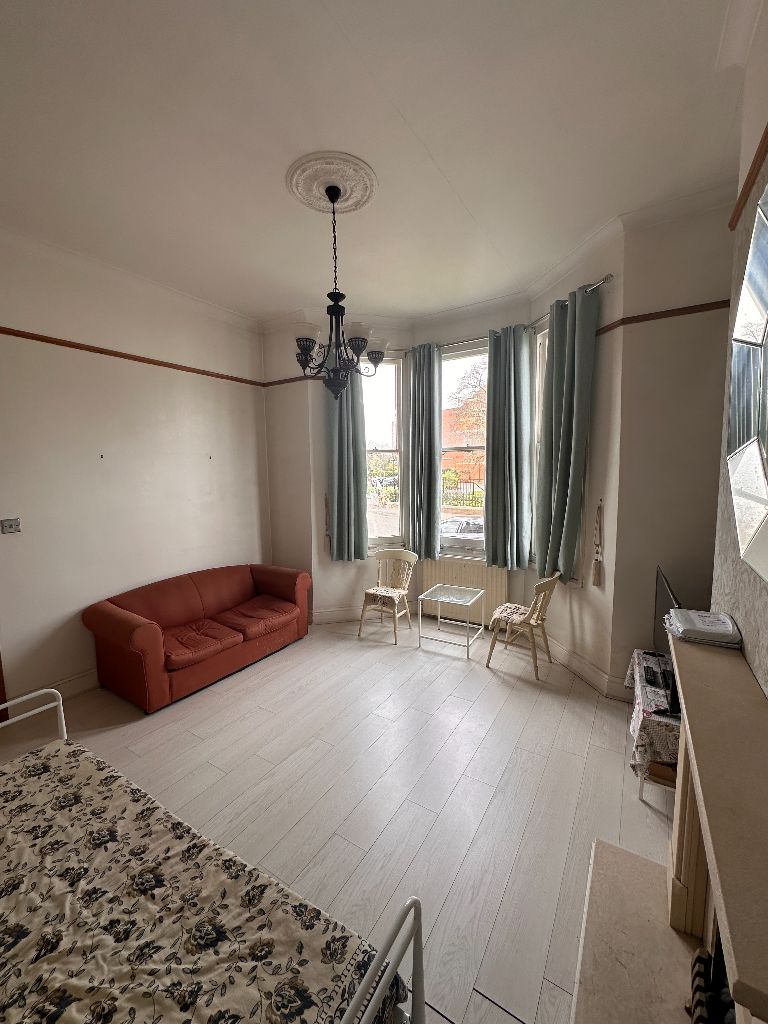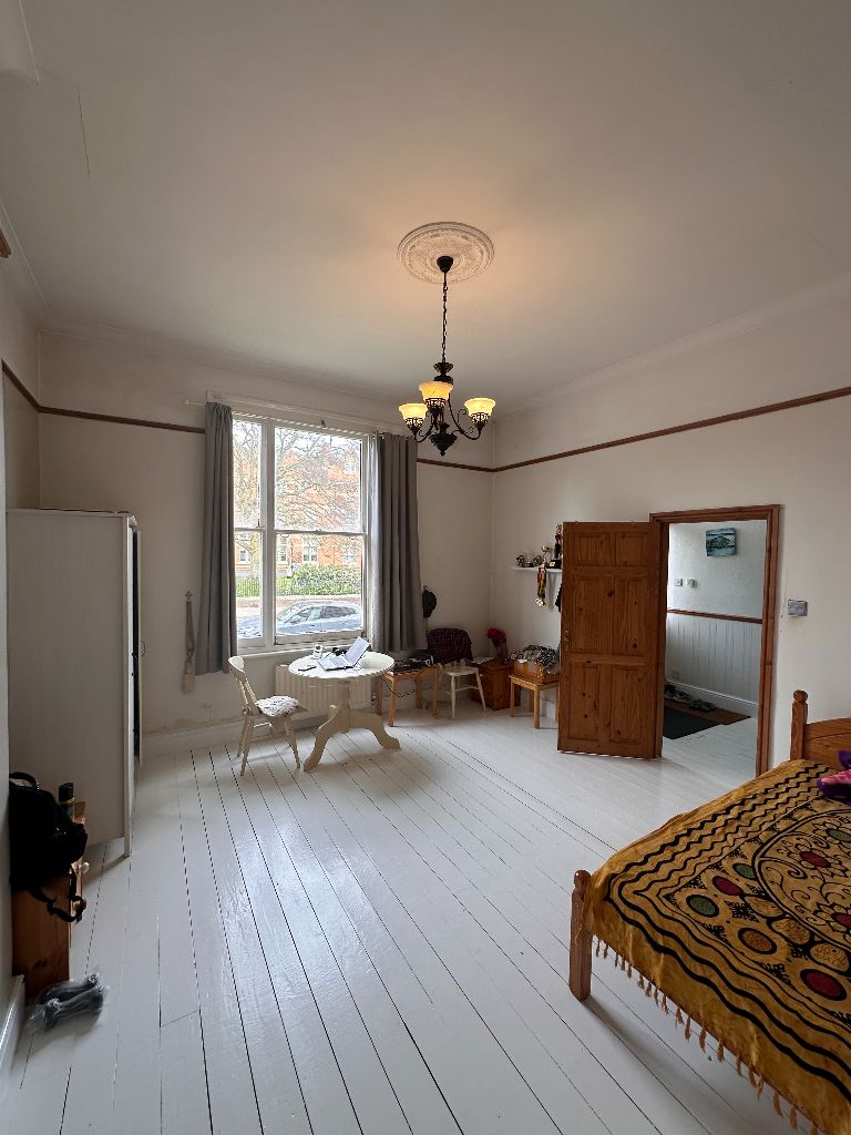 Large double bedroom with wooden flooring, painted walls and single-glazed window to the front
