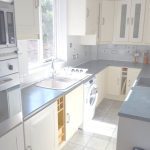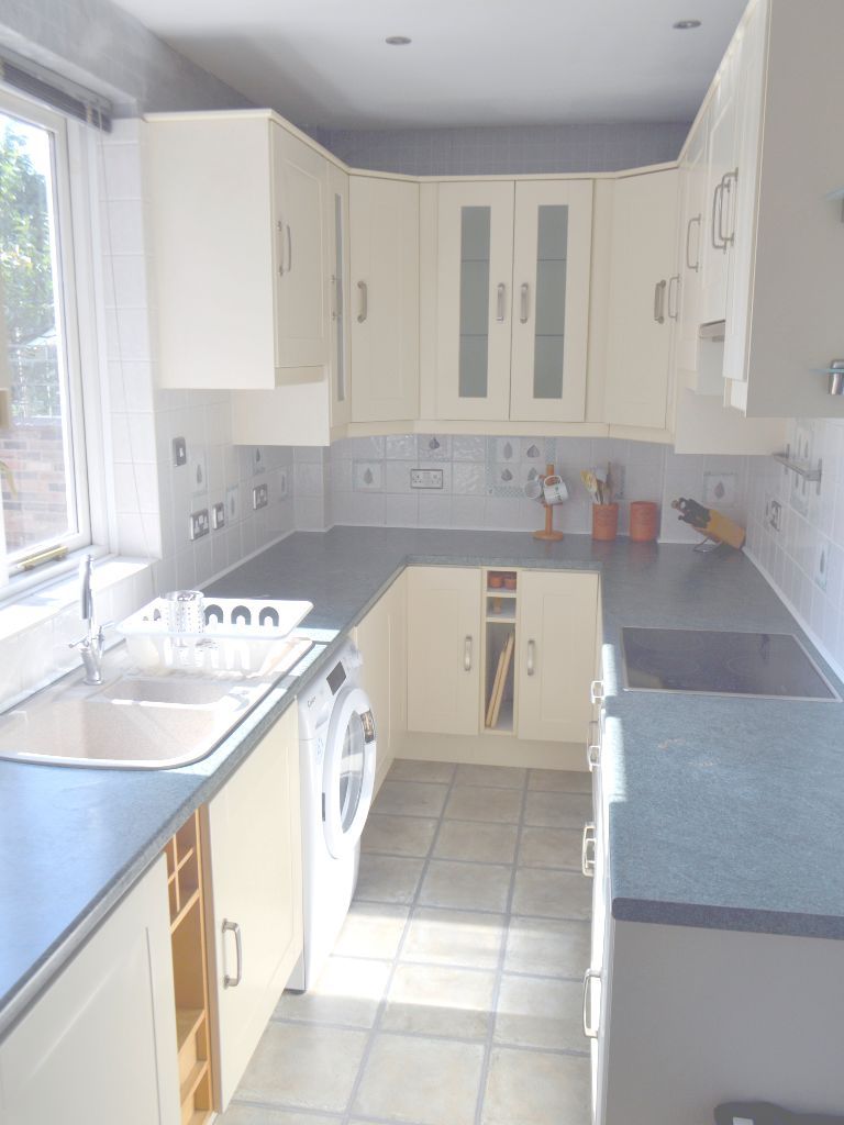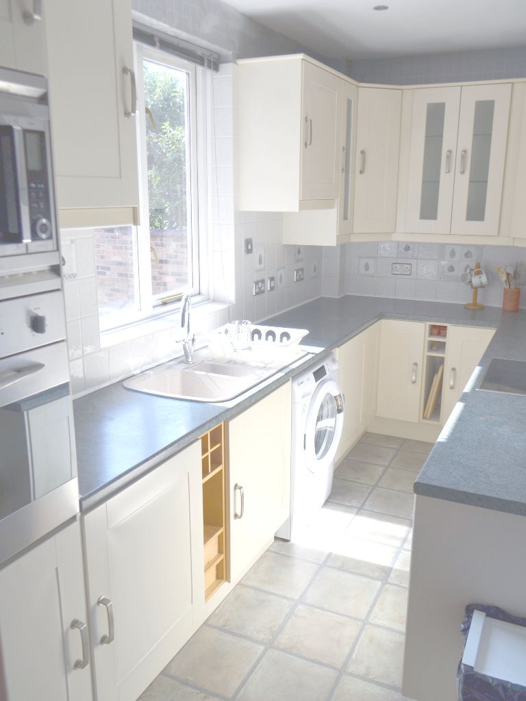 Fitted kitchen with wall and base units having complimentary work surfaces over, sink and drainer, fitted induction hob and oven and double-glazed window to the rear