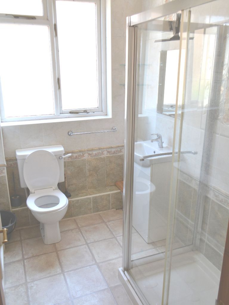With tiled flooring and walls, wash hand basin, low level WC, shower cubicle and double-glazed frosted window